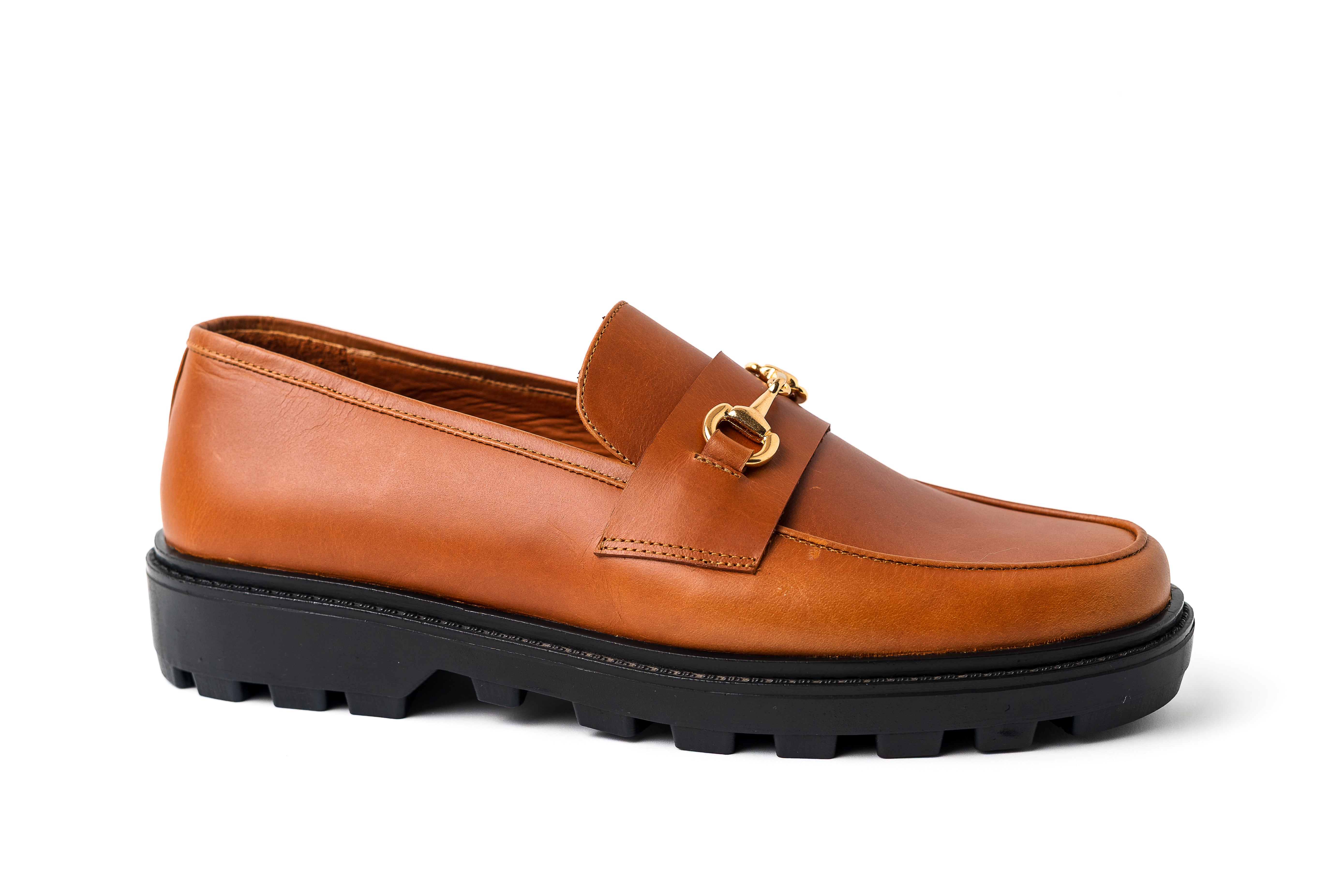 Inspirados en la elegancia urbana con espíritu rebelde, estos loafers están confeccionados en cuero liso color caramelo, con un lujoso herraje dorado tipo horsebit que añade un toque clásico y atemporal. La suela robusta de caucho negro brinda altura, carácter y tracción, fusionando estética refinada con funcionalidad contemporánea. Ideales para quienes buscan un look pulido sin sacrificar comodidad ni presencia. Perfectos para recorrer la ciudad con seguridad o destacar en una reunión informal.